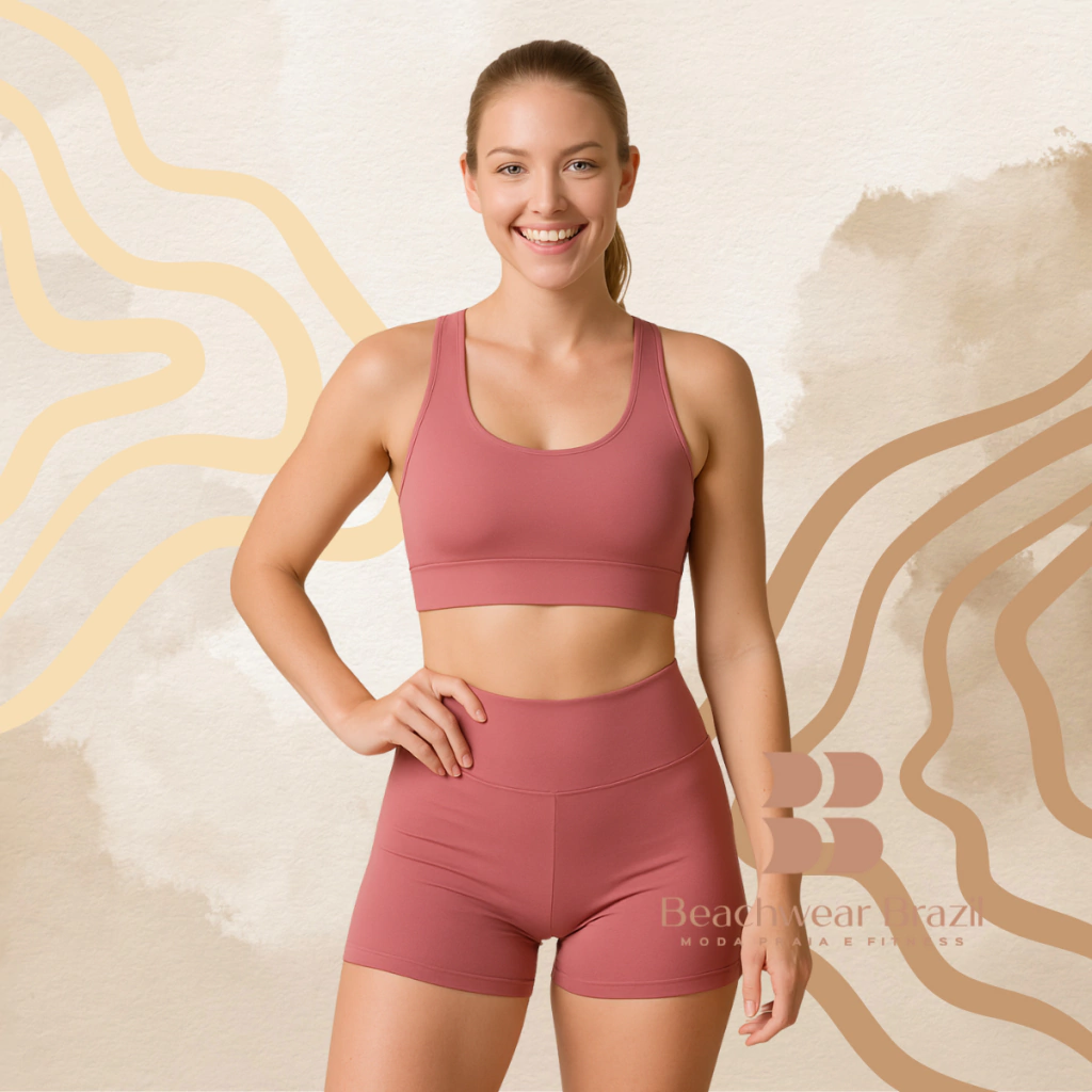 Confeccionado em suplex poliéster com elastano de suave compressão, o conjunto proporciona sustentação, conforto e liberdade de movimento.
